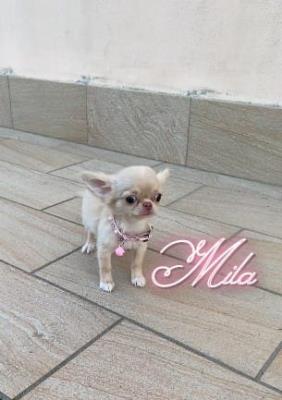 Chihuahua femmina a pelo lungo crema/bianca, taglia piccolina.